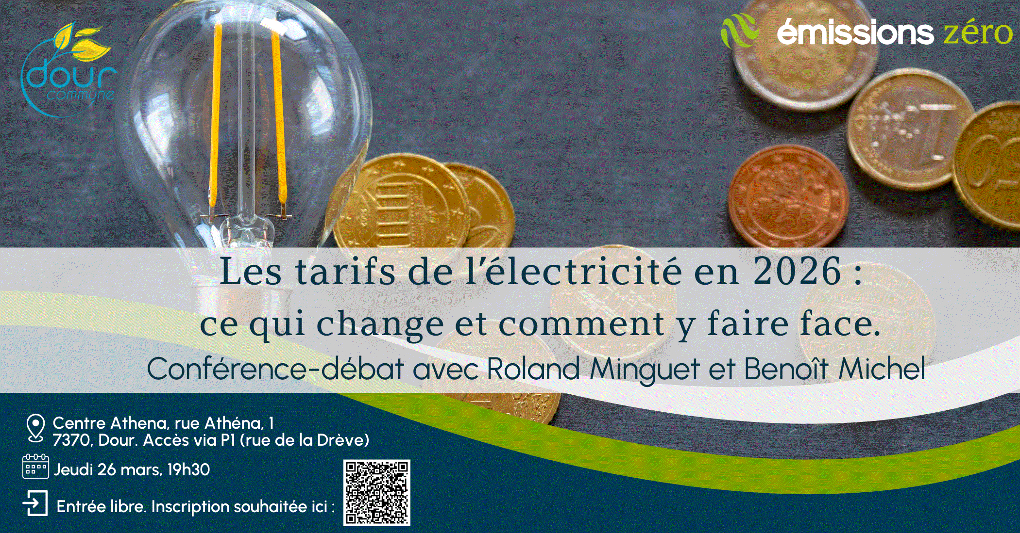 Pour vous aider à y voir plus clair, la coopérative citoyenne Émissions Zéro et la commune de Dour vous proposent une conférence d’information ouverte à toutes et tous. Deux spécialistes, Roland Minguet et Benoît Michel, décrypteront les mécanismes à l’œuvre et partageront des conseils pratiques pour anticiper ces changements et maîtriser votre facture d’énergie.