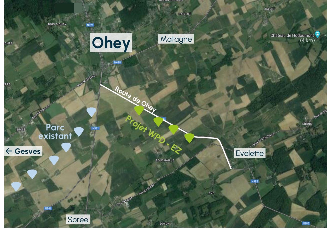 Entre Ohey et Evelette, le long de la Route de Ohey, ce projet de 4 éoliennes est développé par WPD en partenariat avec notre coopérative, à l'est du parc existant. En cas d'obtention du permis, une éolienne sera citoyenne.