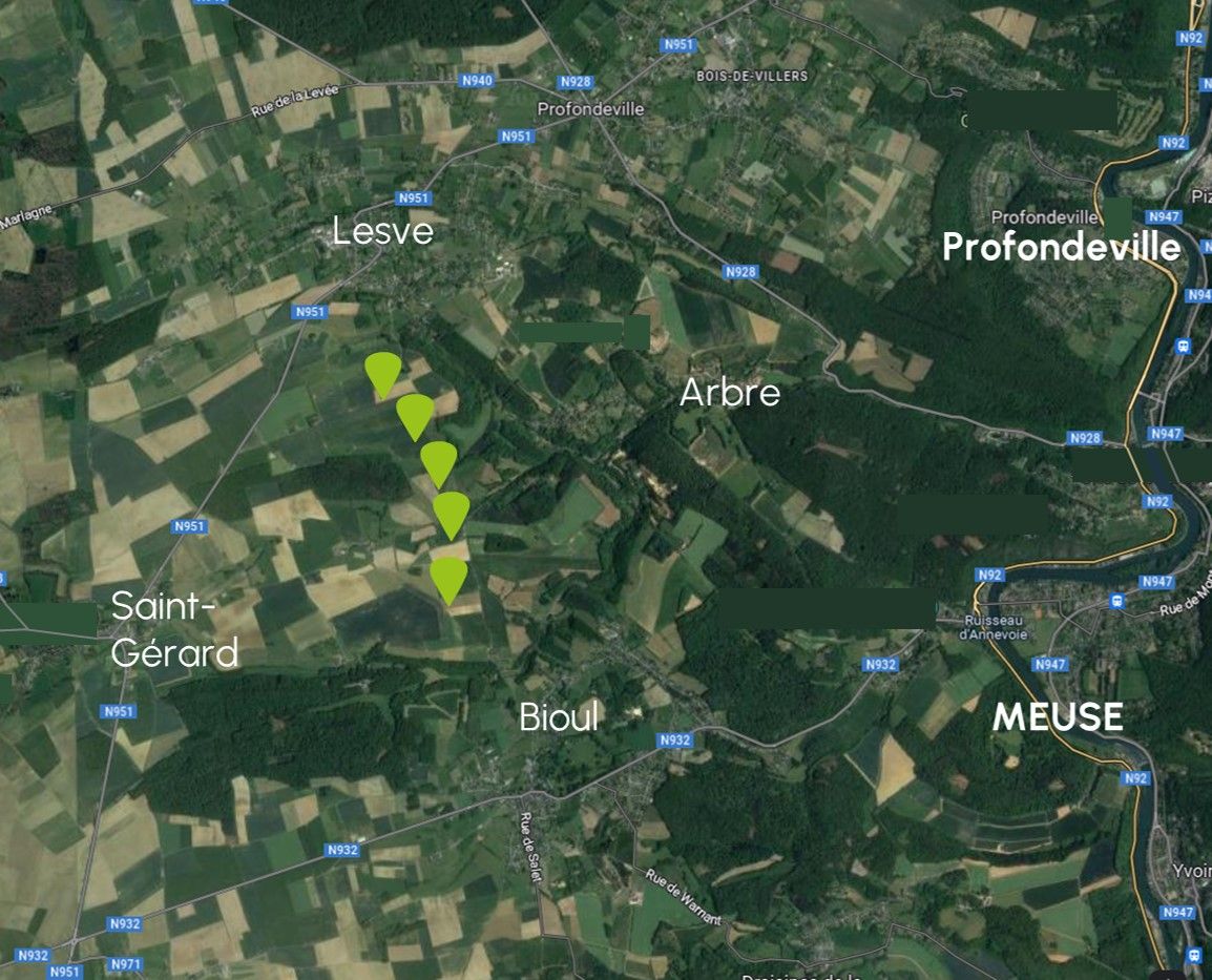 Le projet développé par Luminus est composé de 5 éoliennes, situées entre les villages de Lesve, Arbre, Bioul et Saint-Gérard, Les éoliennes auront une hauteur maximale de 200 m, qui permettent une production très importante avec peu de mats.