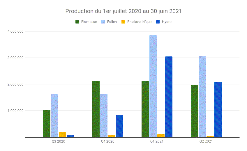 Les sites photovoltaïques ne sont pas en régression grâce au PASS à Frameries qui est venu les compléter avec 100.413 kWh. En effet, il n’était encore nulle part au 1er semestre 2020.